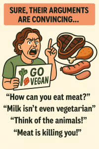 At this stage, you are doing well. But vegan activists are persistent. They have this irritating habit of showing research, health data, environmental impact charts, and facts.