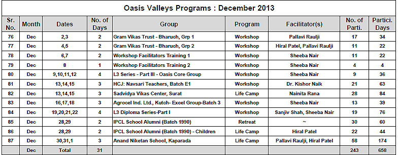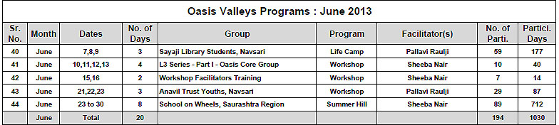 • Special Summerhill Camp for students associated with 'School On Wheels' (a Project run by Sister Nivedita Foundation, Rajkot). 78 Students from 8 Schools of Saurashtra, Gujarat, celebrated Festival of Happiness & Freedom at Oasis Valleys.