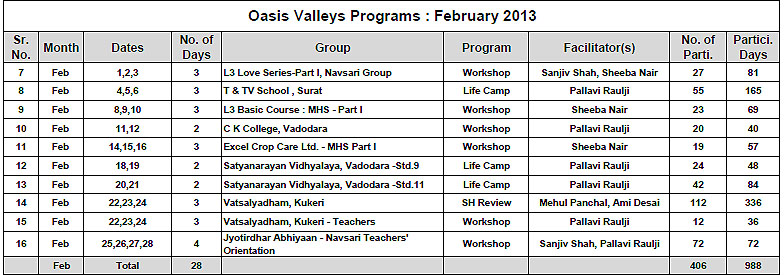 • Group of 9 teachers from Karnataka, associated with Sikshana Project, tasted Oasis Program organized at Oasis Valleys during the month. It was highly appreciated and the teachers committed to join …Jyotirdhar Abhiyaan.