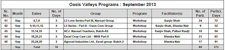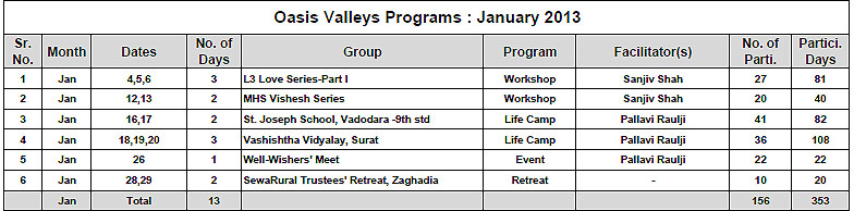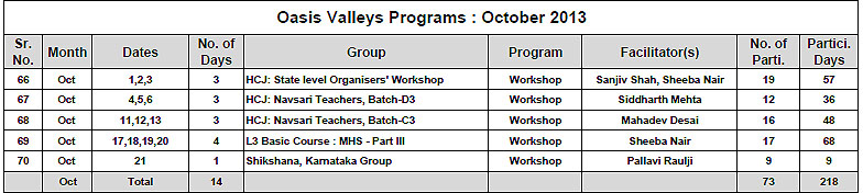 • Oasis Workshops were organized for teachers of Gram Vikas Trust, Bharuch (Gujarat) who wish to join …Jyotirdhar Abhiyaan.