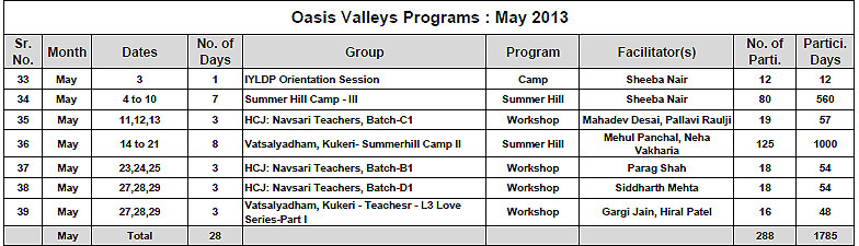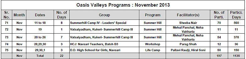 • 113 students of 'Vatsalyadham', part of Shantaba Vidyalaya, Kukeri, Dist. Navsari, participated in the 2nd special Summerhill Camp organized at Oasis Valleys during May 2013. Camp was very important to give big thrust to the growing confidence of children.