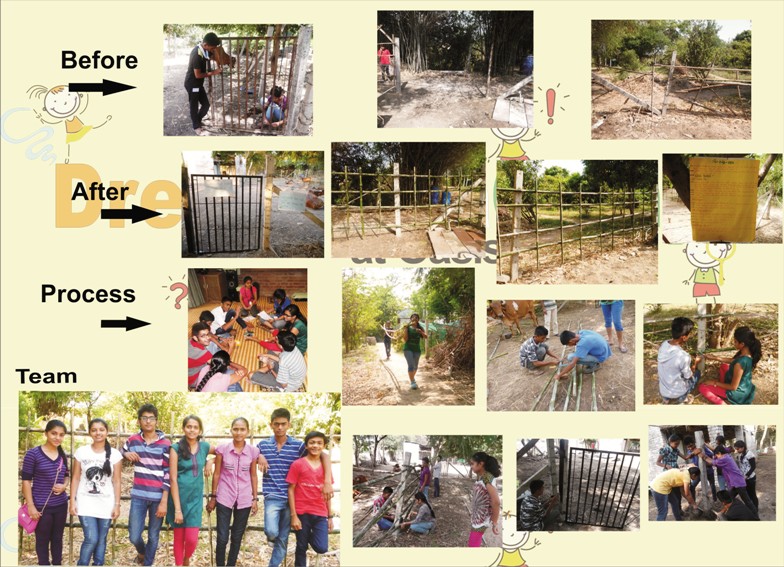 The one team of Campus Beautification took up the challenge to change the face of Oasis Gaushala. The team had to work outdoor in hot sun and without a trace of complain they achieved their goals in given time. They repaired the gate, made new fence from bamboos, removed clutter from Gaushala area, repaired the drainage and put bells around cows' necks. It was tough job and goals were high, but the team showed quite a good strength and completed the task.