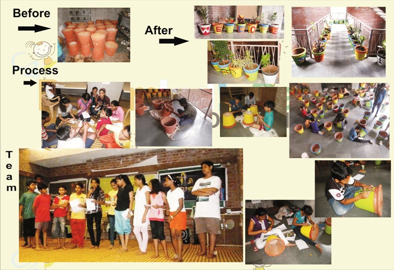 The main objective of this project was to bring greenery into Institute Building. Those who loved Art & Craft, Painting joined this project. The Target was 100 Pots ready with plantation done. Team of dozen participants took the challenge. They planned and visualized every pot. After 7 days hard work 94 pots got ready - painted & decorated - for plantation. On the last day, defying the general rule of plantation, they planted 53 decorative plants in scorching heat of summer noon with utmost care. They worked very hard, way beyond our expectations, they received help from other team members as well when it was needed.