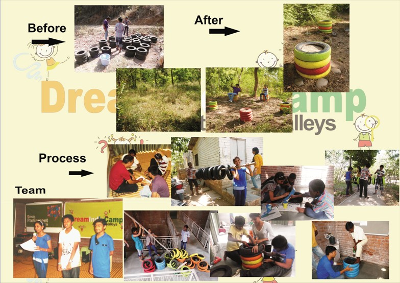 The second team of Campus Beautification took up challenge to convert waste tyres into beautiful sitting arrangement. They started a day later and had to work hard. They worked upon 90-100 tyres & finished their goals on the last day with the help of other participants. Team of 4 created some nice sitting arrangements which were placed at Sun-rise & Sun-set points at Oasis Valleys.