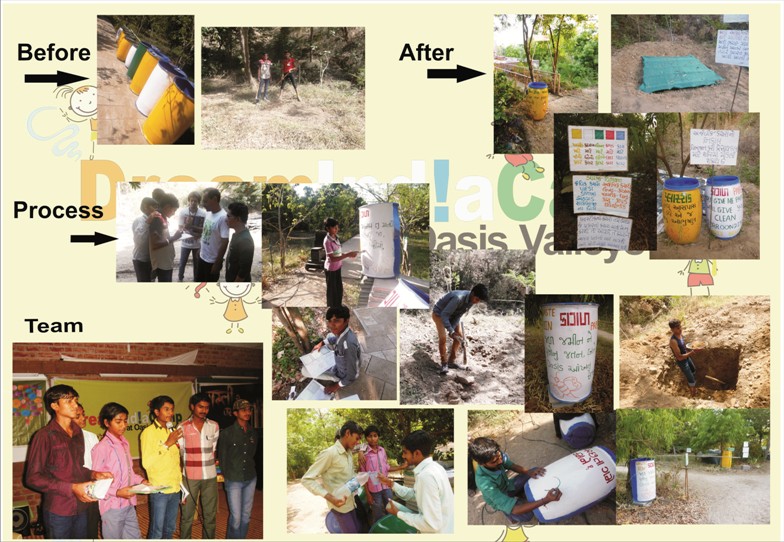 The team of leaders, 7 of them, took the project of setting the waste management system at Oasis Valleys campus. The work was divided into two Phases - 1. System for Bio degradable waste & 2. System for Bio non-degradable waste. The job of digging pits for food waste in the open during the afternoon hours in hot sun was real hard work which was mainly done by 2 boys. For non-degradable, 14 waste bins were designed & painted and put at logical points on whole campus to collect the waste segregated in four parts - Plastic, Paper, Metal & others - to be sent to recyclers.