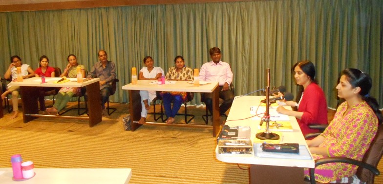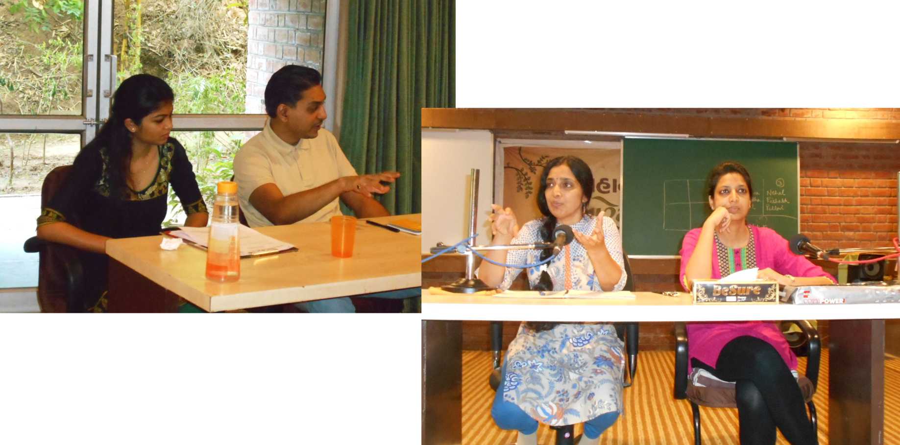 Participants (left photo) seen in discussion with facilitator Sheeba Nair & co-facilitator Hiral Patel (right photo)
