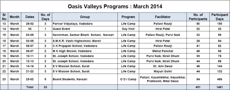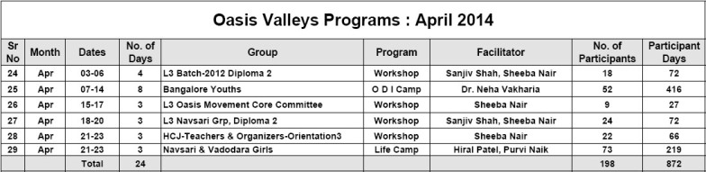• Under the project of Oasis Schools (promoting schools working on principles of Freedom & Happiness), first meeting was organized at Oasis Head office, Vadodara, on 8th April, 2014, where 26 people – school authorities, principals & leading teachers – had taken part.