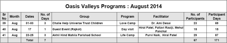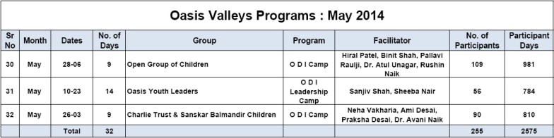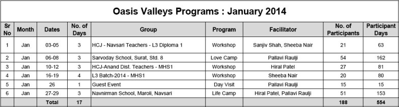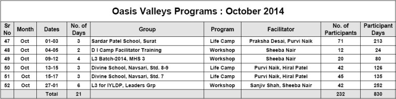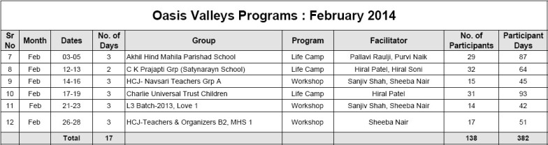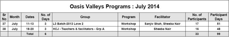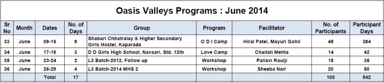 • New chapter in Oasis Character-building Education Movement began with the first workshop of Oasis L3 Course for Teenagers. 42 young leaders experienced L3 Course and appreciated it very much. Sanjiv Shah & Sheeba Nair facilitated the first workshop, which lasted for 6 days.