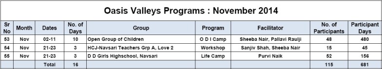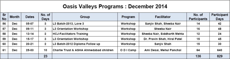 • Dozen Oasis Camp Facilitators planned 15 Dream India Camps for year 2015 in their first training workshop, which was facilitated by Sheeba Nair.
