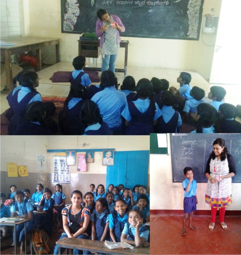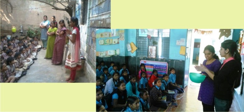 Two more events on Hygiene Awareness were organized on 10th January, 2015. 1st in Govt. Primary School, Kethmaaranhalli, Rajajinagar, Bangalore which was conducted by KLE College youths – Keerthana & Akshata, where 56 students participated. 2nd program was conducted in St. Xavier School, Mahalaxmi Layout, Bangalore by Roshni & Aishwarya, also the students of KLE College. 36 students participated in this event. |