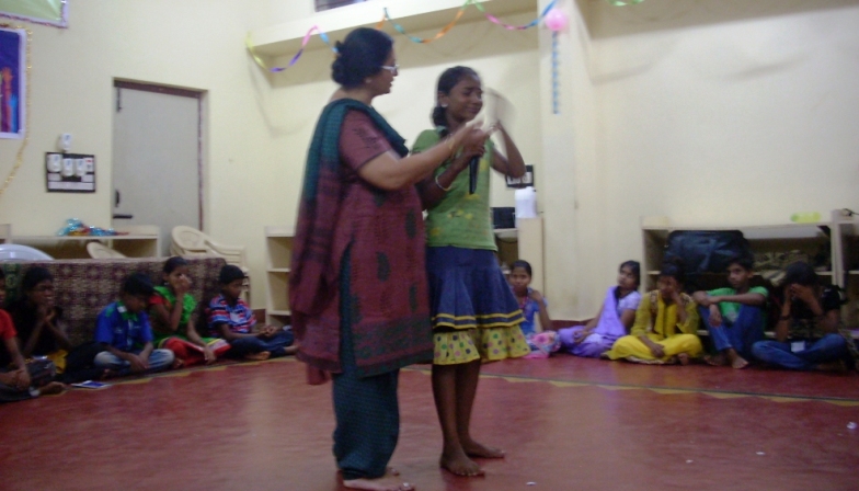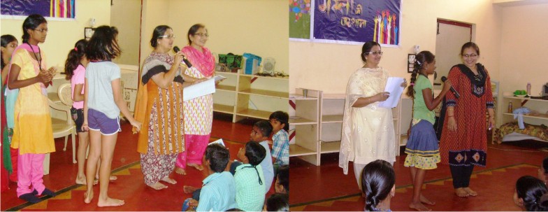 (Photo left) Vibha Kapasi (speaking on mike), facilitator, addressing children; (Photo right) Neeta Sanghvi (on right), facilitator, encouraging participant.