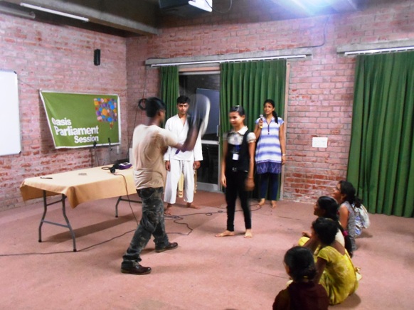 A special session was organized during the camp for learning Self-defense. A Karate Master - Sensei M. Maharaj, 4th dan black belt in Kaizen Wado Karate, who has won gold medals in World Championships – was invited to share some techniques of self-defense especially for girls. He was assisted by Sempai Vivek Parekh, purple belt holder. |