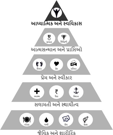 અબ્રાહમ મેસ્લો નામના વિજ્ઞાનીએ એમ સમજાવ્યું છે કે મનુષ્યની જીવન ટકાવવાની, મૂળભૂત શારીરિક, સલામતી, અને પ્રેમ-સ્વીકારની જરૂરિયાતો સંતોષાતા છેવટે તેઓ પોતાની આધ્યાત્મિક જરૂરિયાત તરફ વળે છે. પોતે કોણ છે? પોતાની અંદર શું સંભાવનાઓ પડેલી છે? હું શું કરું તો મને અદમ્ય સંતોષ અને આનંદની અનુભૂતિ થશે? હવે પિરામિડની ટોચ પરના આ છેલ્લા તબક્કામાં મનુષ્યનું જીવન સ્વ-અભિવ્યક્તિ બને છે. તેની જરૂરિયાત હવે કેવળ આત્મસંતોષની છે. તેનું જીવન આ જ તબક્કે સાચા અર્થમાં પ્રફુલ્લિત થાય છે. |