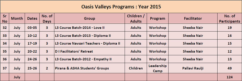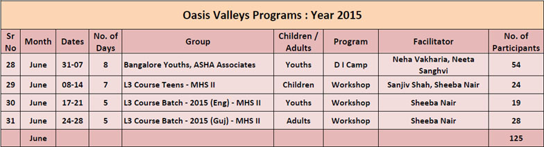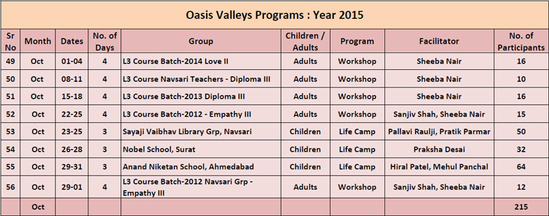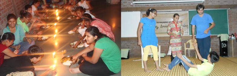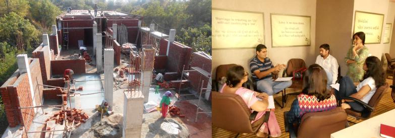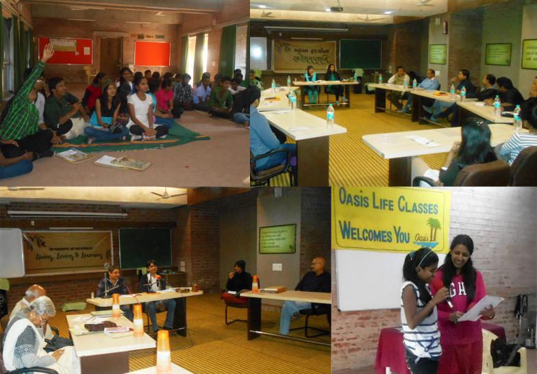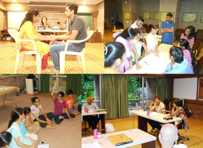 (Above collage) from top left, clockwise - Couples listening each other in workshop on marriage; D.I.Camp facilitators planning camps in learning retreat; Facilitator Sanjiv Shah explaining concept in L3 Course Workshop; Facilitator Pallavi Raulji listening to a participant in Leadership Development Camp |