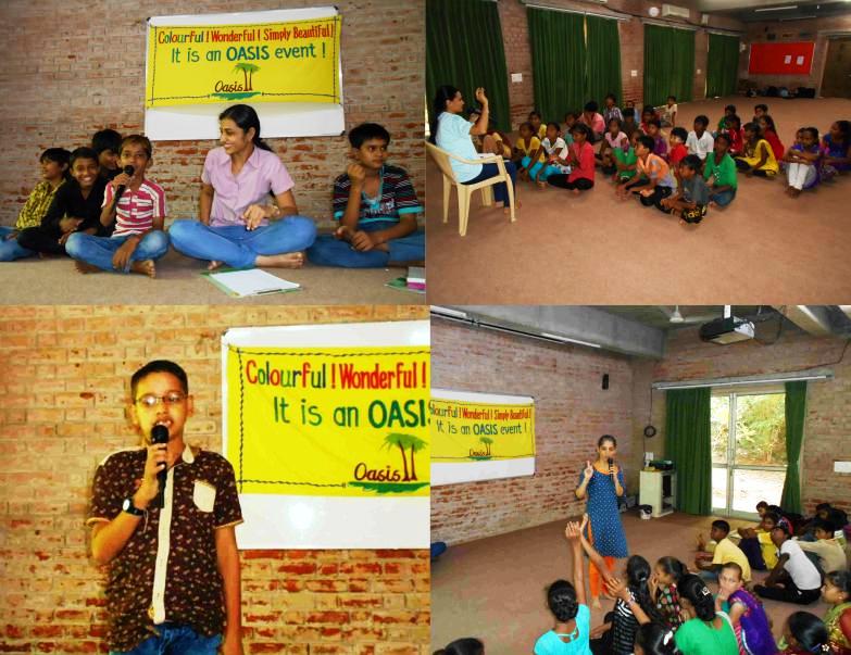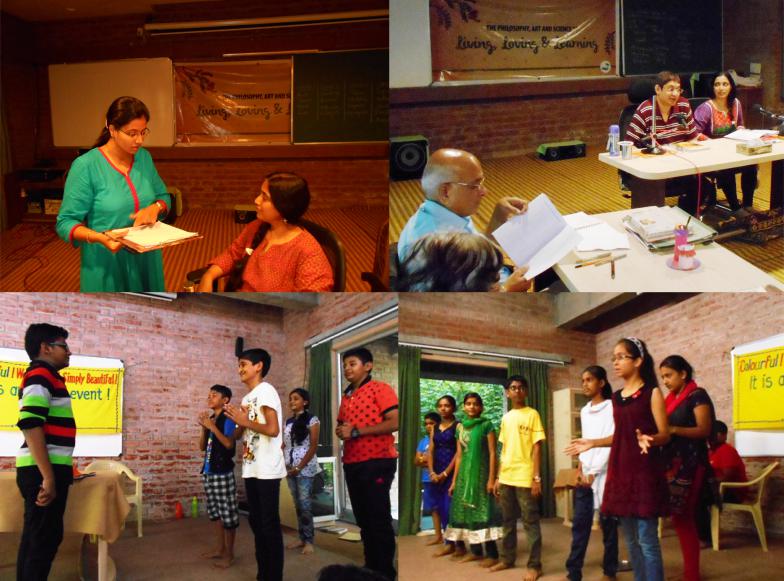 (Above collage) from top left, clockwise - Purvi Naik helping students to participate; Praksha Desai sharing the concept; Pallavi Raulji interacting with students; Student sharing his dreams |
